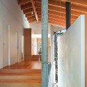 One third of the space within the house, made up of guest rooms, an office and the main entrance, is located at the lower level adjacent to the base of an existing one storey rock embankment. The overhanging mass of the building and its canted wall defines the main entrance and creates a covered space for unpacking and packing – a familiar cabin ritual associated with those important moments of arrival and departure.